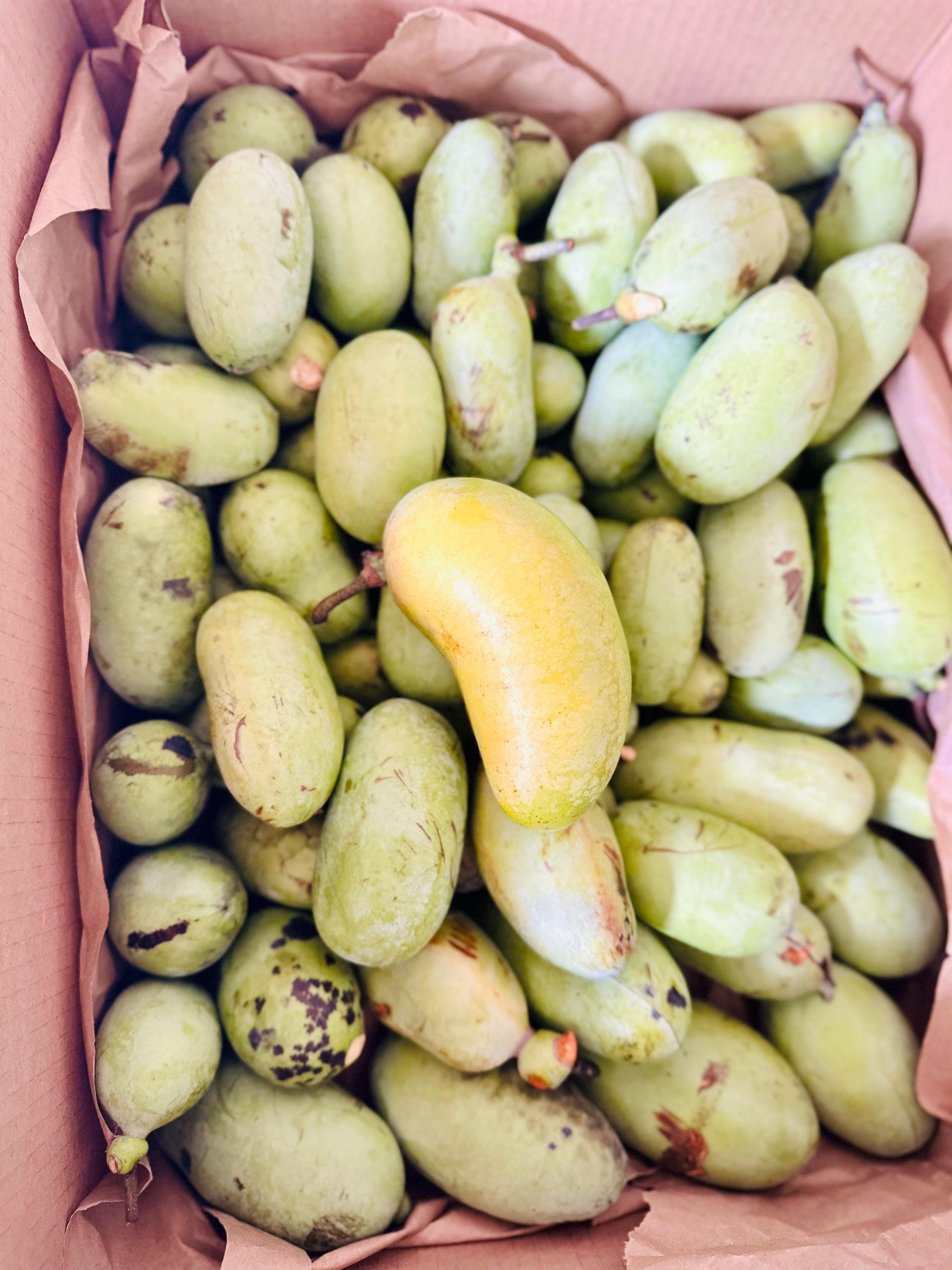 The pawpaw fruit has a tropical flavor that is commonly described as a cross between banana, pineapple, and mango, with hints of passion fruit. The flesh is creamy and custard-like, and the fruit varies in color from butter yellow to sunset orange.